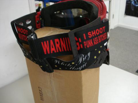 JT USA This is a one of a kind JT Pro Flex Goggle System!! You are looking at the sweetest Pro Flex ever. It has the 2 custom straps on it, one says WARNING: I SHOOT PUNK ASS BITCHES! The other says WHITE BOY MAGIC. It has the Hybrid Contract Killer logo across the top of the lens, and has the "HT" (Hybrid Technologies) logos in a wall paper design from side to side across the nose piece. It is used, but in great condition. Don't miss this one! Price is $100.00. Or will trade for something of equal or more value. Don't try to low ball me on this, because that would be a insult to these masks and me. Custom Pro Flex masks are going for much more than this on the nation that are nowhere nere as nice or cool.